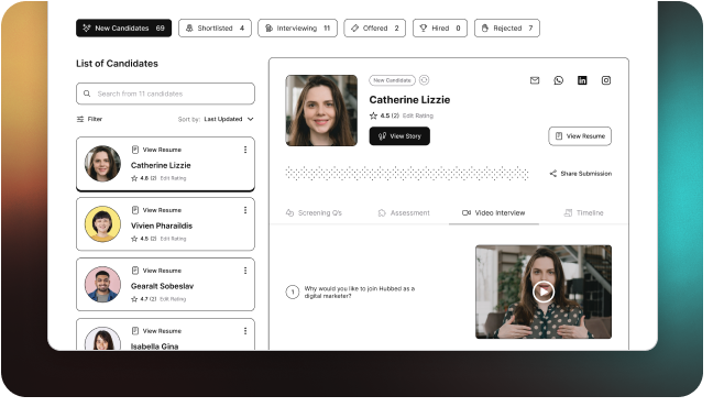 With Hubbedin, you can see more than just their resume. You can see how they present themselves in a video format, their background stories, and what they value.Rate Candidates in All Aspect